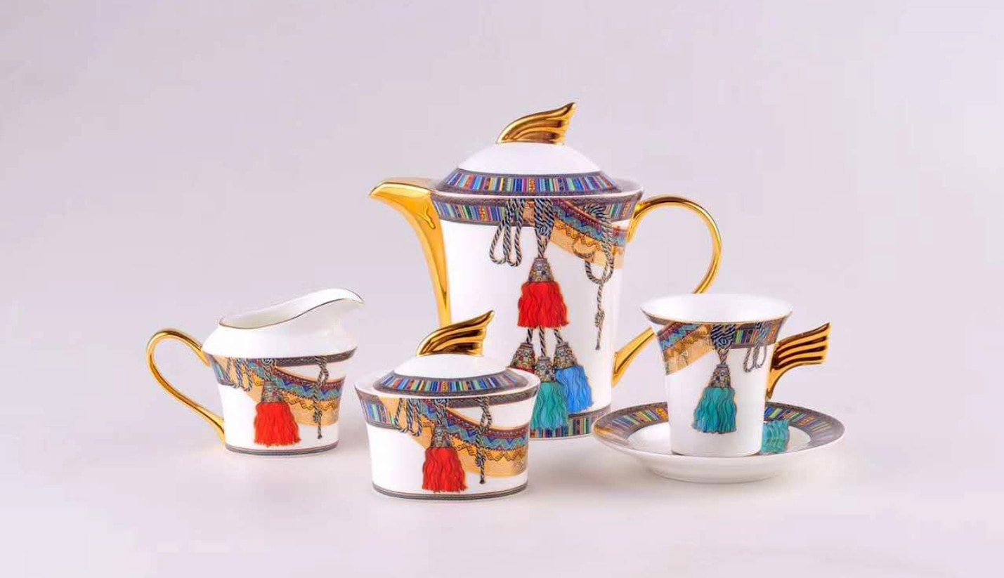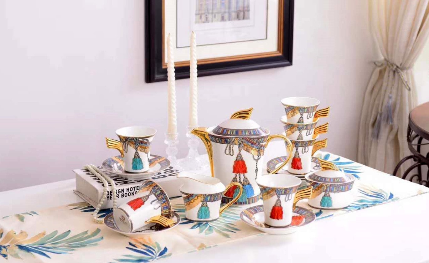 - Một bộ bao gồm: 1 bình pha trà + 1 bình rót trà + 6 chén + 6 đĩa nhỏ + 2 đĩa lớn.