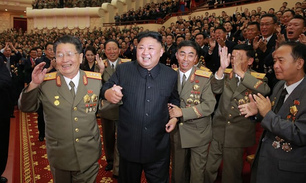 | Nhà lãnh đạo Triều Tiên Kim Jong-un cùng các tướng lĩnh ăn mừng vụ thử bom nhiệt hạch thành công. |