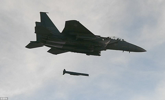 | Máy bay F-15K thả bom trong cuộc tập trận. Ảnh: EPA |