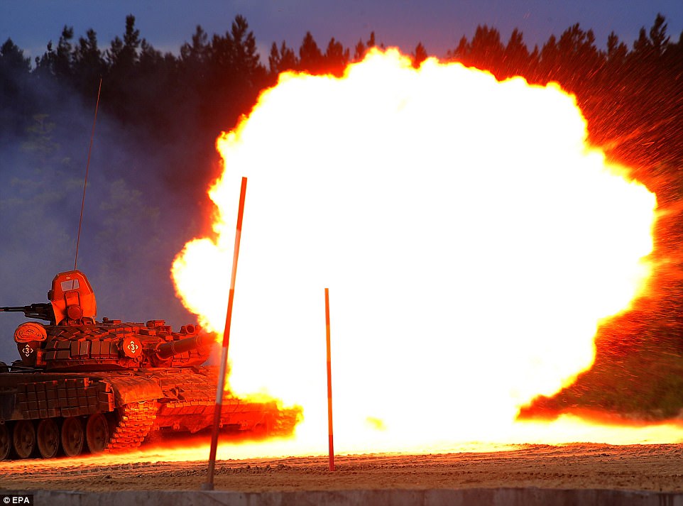 | International Army Games 2017 năm nay bao gồm 28 bộ môn thi quy tụ nhiều khí tài quân sự tối tân nhất của các đội thi và 4.000 nhân viên quân sự. Trong ảnh, xe tăng T-72 của Nga khoe hỏa lực kinh hoàng trong vòng cuối của phần thi "Tuyến đường an toàn". |