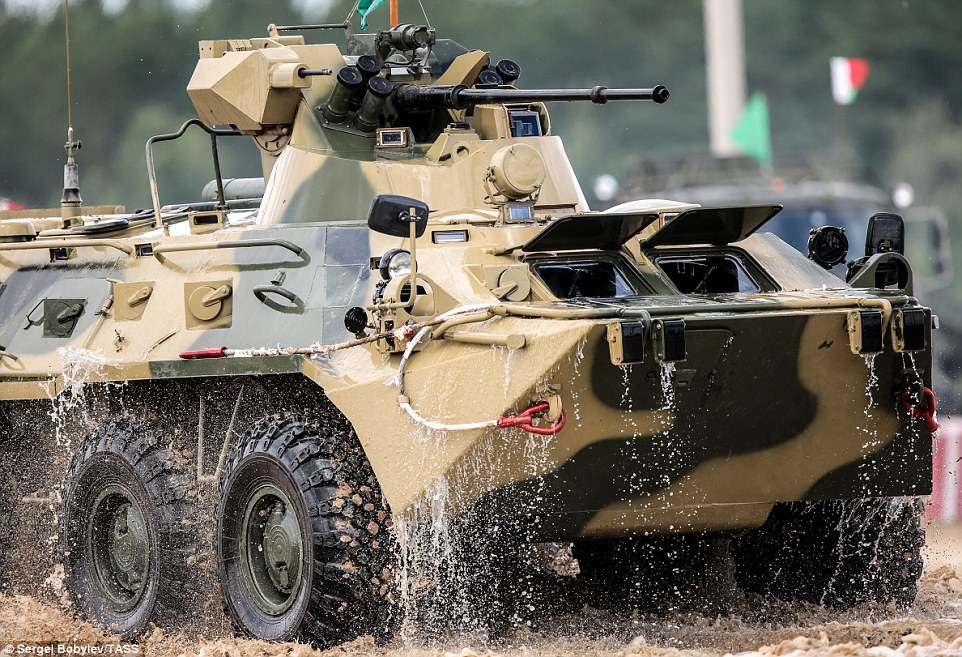 | Các xe tăng dự thi sẽ di chuyển trên địa hình vòng vèo, nhiều chướng ngại vật dài 5 km, vừa đi vừa bắn các mục tiêu. Trong ảnh là xe bọc thép chở quân BTR-82A của Uzbekistan. |