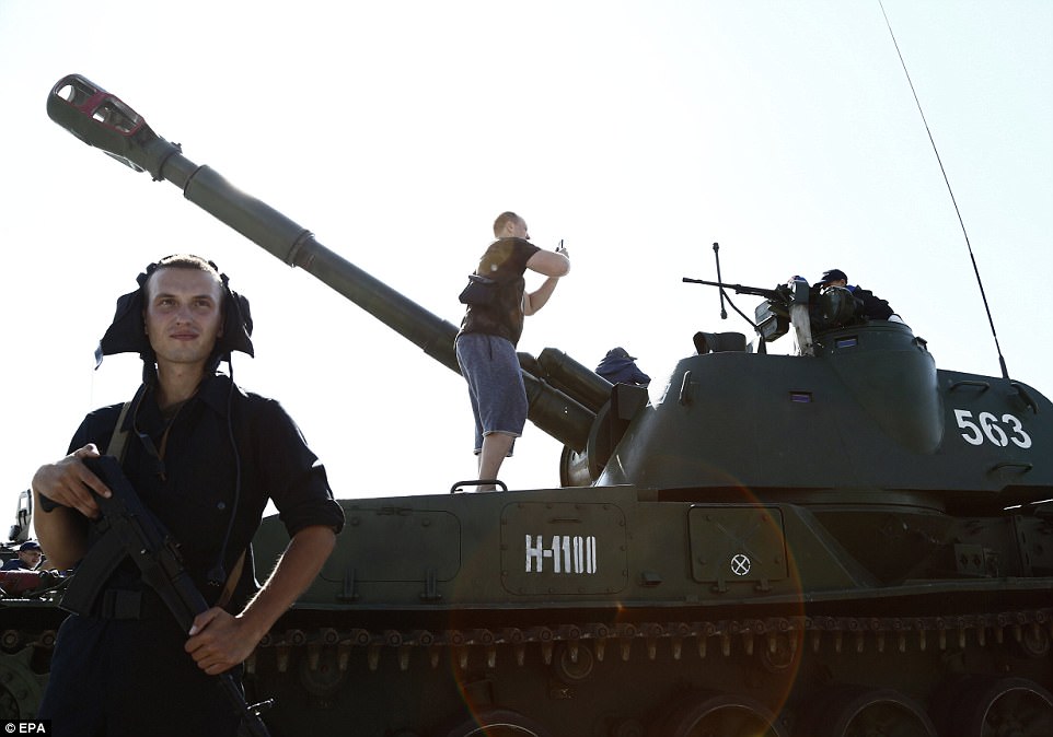 | Chàng trai trẻ đứng chụp với hệ thống pháo tự hành SAU-2S3 của Nga. |